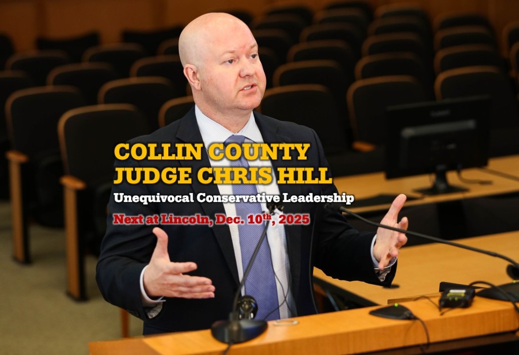 Happy December, Lincoln Society! This month we welcome Collin County Judge Chris Hill, recognize his tremendous conservative accomplishments, and thank him for his service to us—citizens and taxpayers! He’ll give us the flyover of our State of the County and describe his vision for what we must accomplish next. And, we look forward to hearing him and finding out what we can do to help.